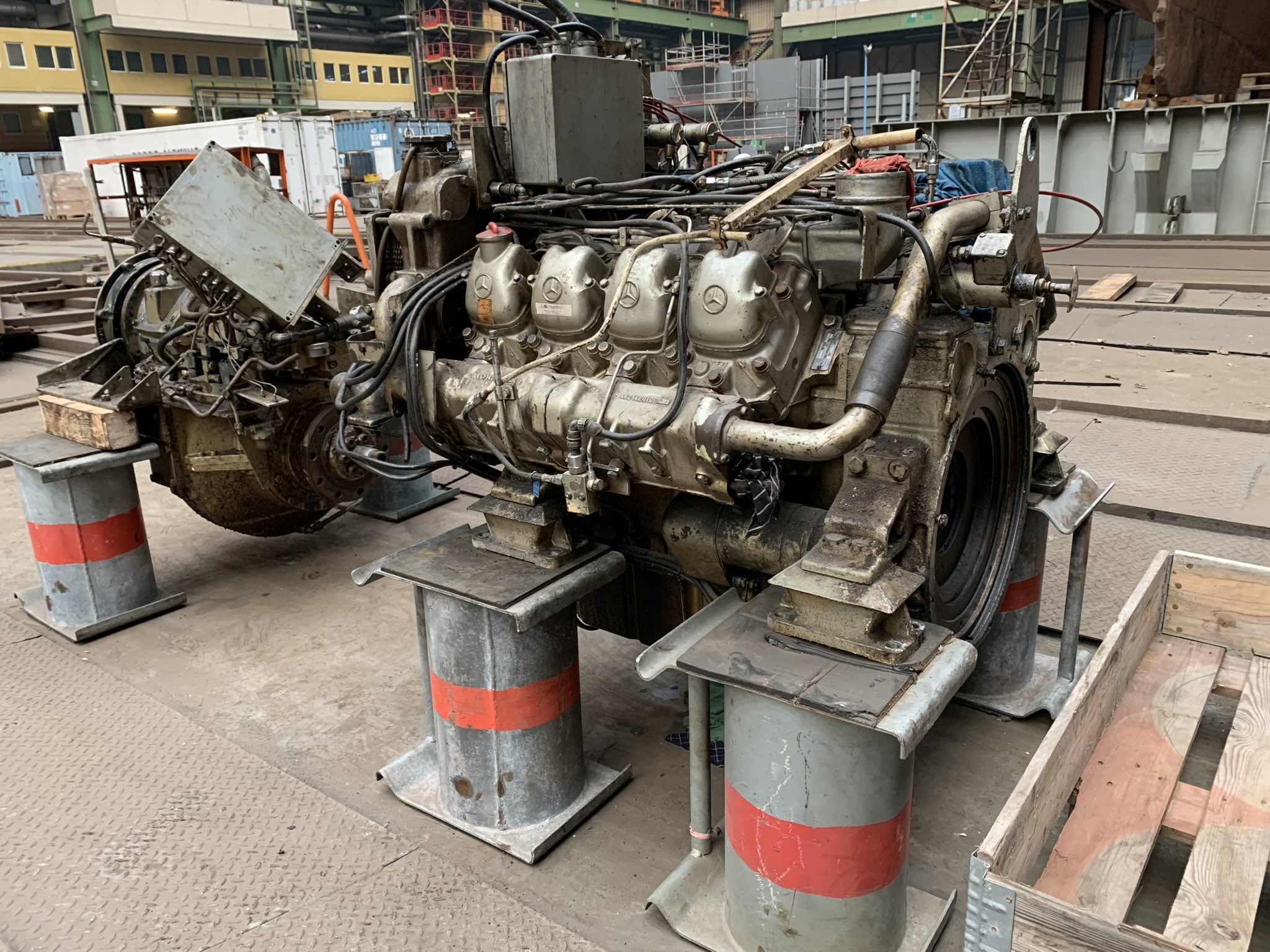 Wie geplant sind in dieser Woche mehrere schwere Aggregate und Maschinen durch die Öffnungen im Haupt- und Zwischendeck aus dem Rumpf der GREIF herausgehoben worden: zwei Generatoren sowie ein großer Kompressor mit Arbeitsluftflasche und die Antriebsmaschine (MTU, 8 Zylinder, 233 PS).