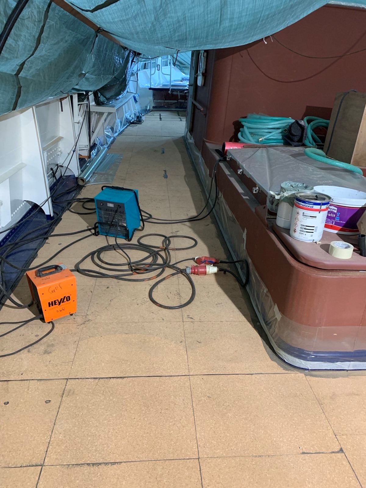 Derzeit sind die Fachleute dabei, die gesamte Decksfläche plan zu schleifen. Nach dem Aushärten des Klebers wird darüber eine 20mm starke Schicht aus heimischer Douglasie verlegt, wodurch die traditionelle Optik und Funktion des Holzdecks erhalten bleibt. Dieses spezielle Komposit-Verfahren aus Holz und Kork spart vor allem Gewicht und hat zusätzlich sehr gute Dämm-Eigenschaften (Temperatur- und Schalldämmung).